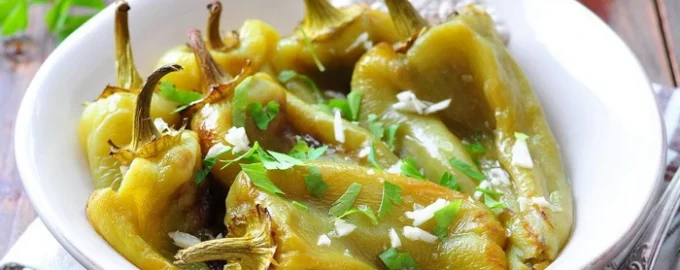 - Orta ateşte bir tavada bitkisel yağı ısıtın, dolmalık biberi ekleyin, bir kapakla örtün ve her tarafı altın rengi kahverengi olana kadar kızartın, ardından plastik bir torbaya koyun, 10 dakika bekletin ve kabuğunu çıkarın.