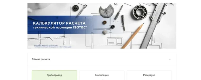 Yalıtılacak ekipmanın tipini (boru hattı, havalandırma, tank) seçmek, temel parametrelerini ayarlamak, yalıtım tipini ve hesaplamanın hangi kriterlere göre yapılacağını belirtmek yeterlidir. Sistem gerekli katman kalınlığını belirleyecek, kurulumu için en uygun yardımcı sabitleme elemanlarını önerecek ve beklenen yüzey sıcaklığını ve tahmini ısı kaybını gösterecektir.