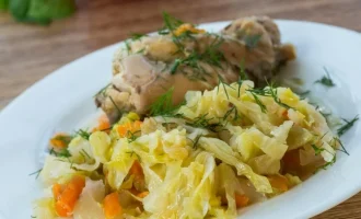 - Tavuk. Filetoyu defne yaprağı, karabiber ve dereotu ile tuzlu suda kaynatın. Soğutun ve ince liflere ayırın.