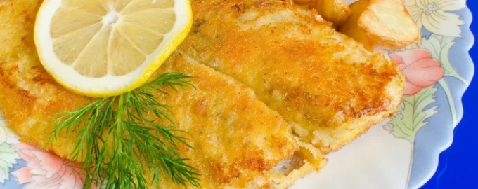 Fotoğraf: açık kaynaklardan Sebze salatası ile servis yapın Panelenmiş balıklar sulu ve yumuşak olur ve çıtır kızarmış patates ve peynir kabuğu mükemmel